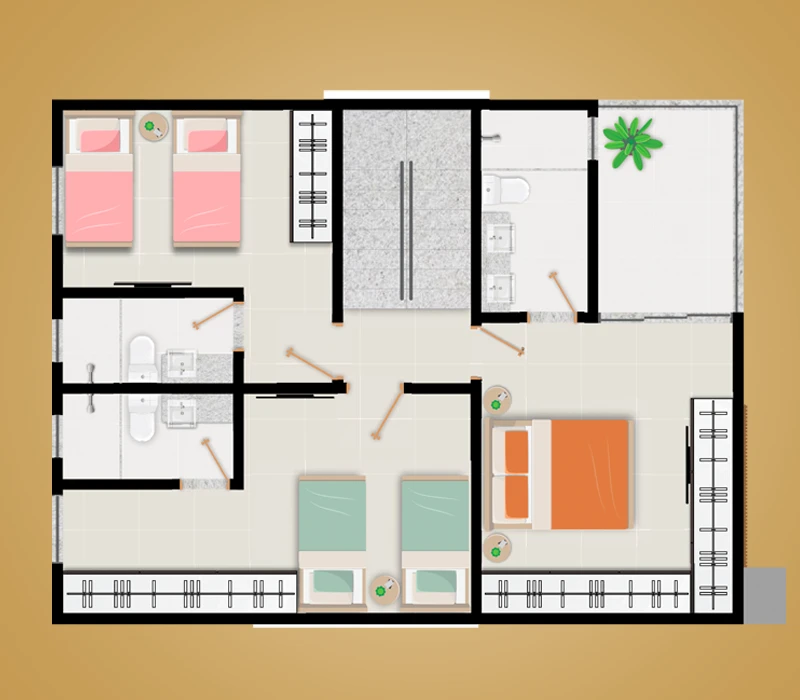 Os móveis de dimensões comerciais, objetos de decoração, pisos, rodapés, molduras, sancas de gesso e alguns pontos de iluminação são sugestões de decoração, não fazendo par te do contrato de aquisição. As medidas são internas e de face a face das paredes. As áreas comuns serão entregues mobiliadas e equipadas conforme memorial descritivo do empreendimento. As cores, materiais, equipamentos e vegetações poderão sofrer pequenas alterações conforme disponibilidade do mercado.